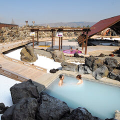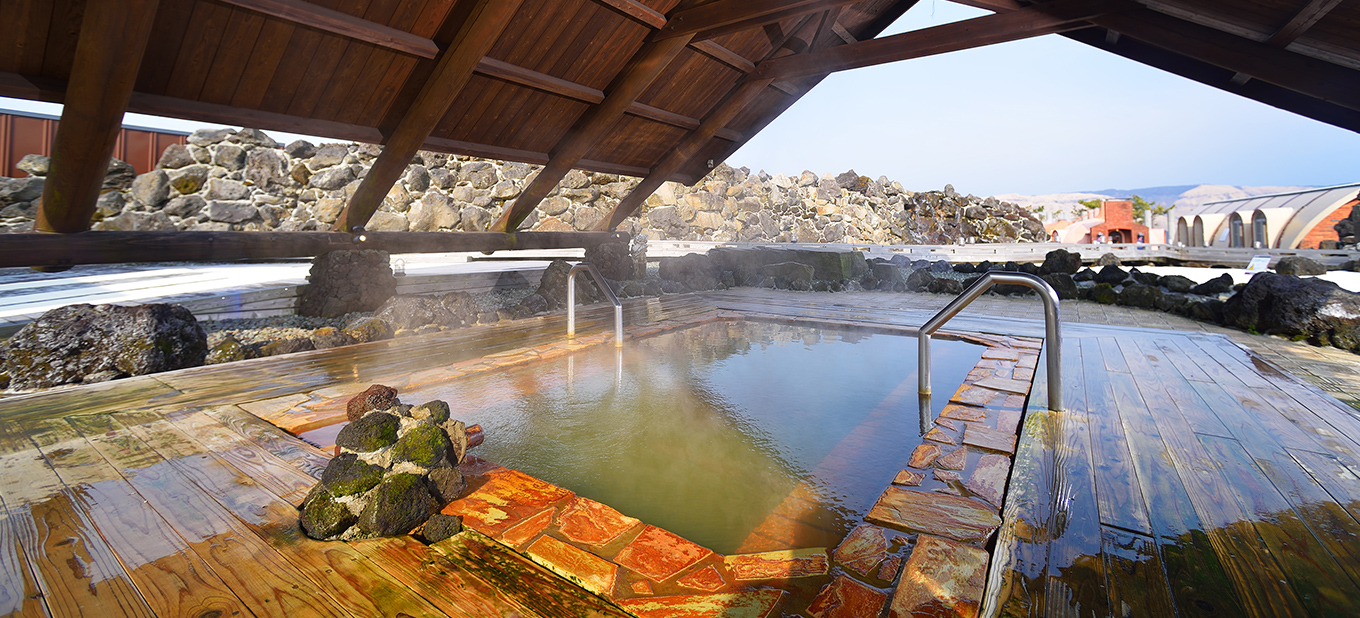 1000平方米的大型温泉设施,男女皆可使用。在开阔的室外区域,您可以在150m长的木栈道上全身心地感受大自然,享受15种不同的热水沐浴方式。