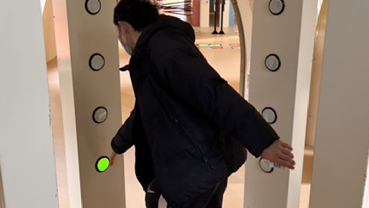 按下周围柱子上亮起的灯来扭转你的身体。伸展你的肌肉,让它们得到充分的伸展。