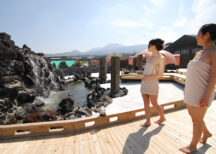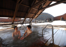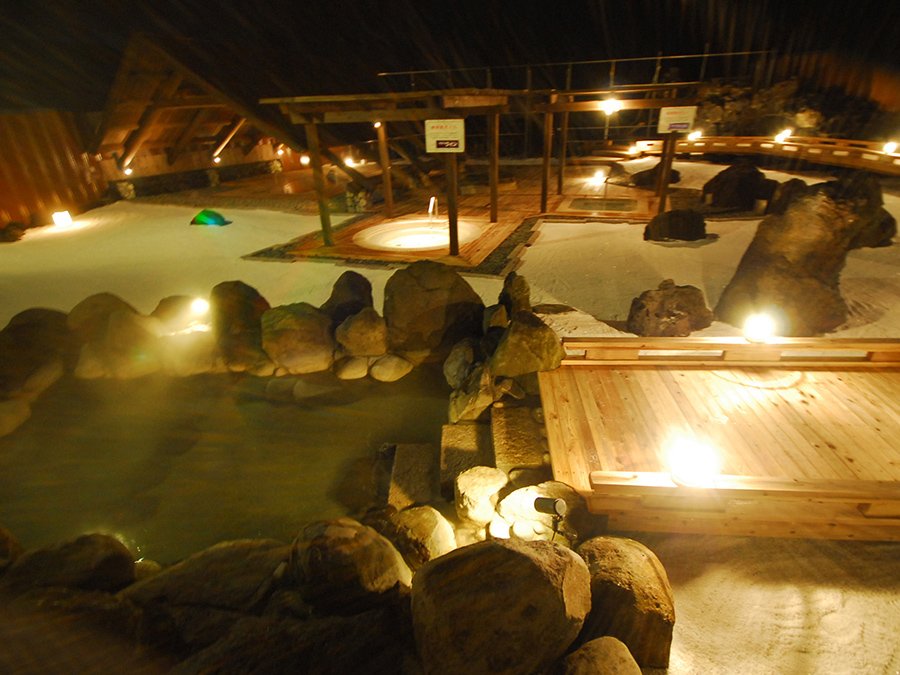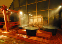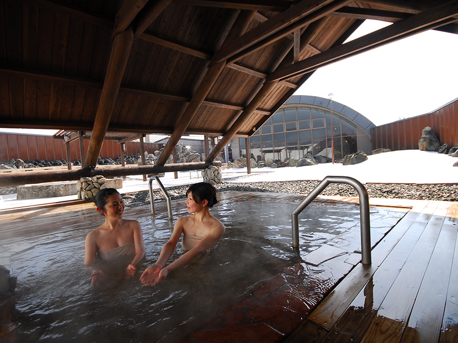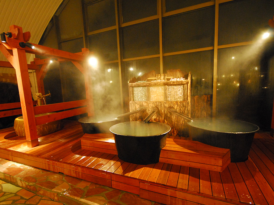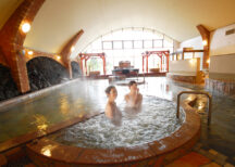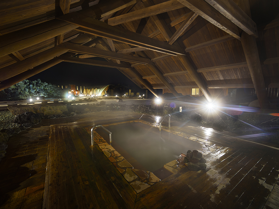 1000平方米的大型温泉设施,男女皆可使用。在露天的室外区域,您可以在150m长的木质长廊上全身心地感受大自然,享受15种不同的热水浴风格。