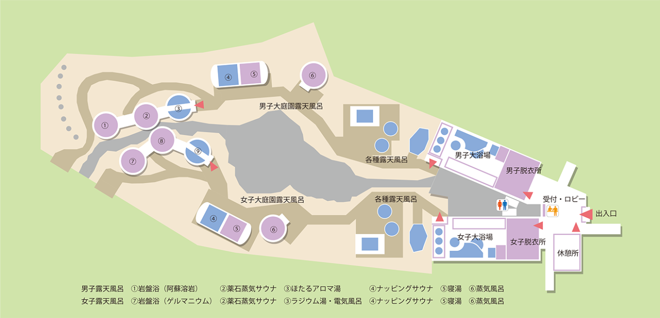 大自然阿苏健康之森精心设计的健康温泉,让您体验大自然。请根据您的目的和身体状况任意组合使用。