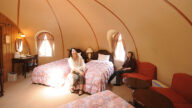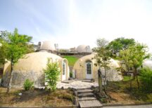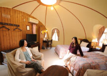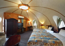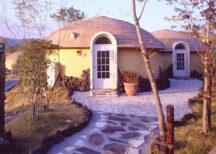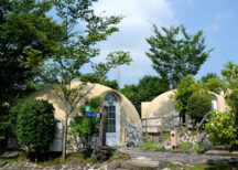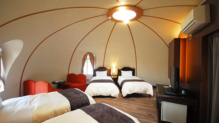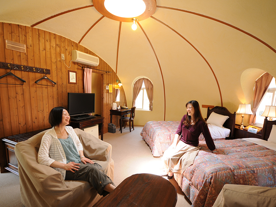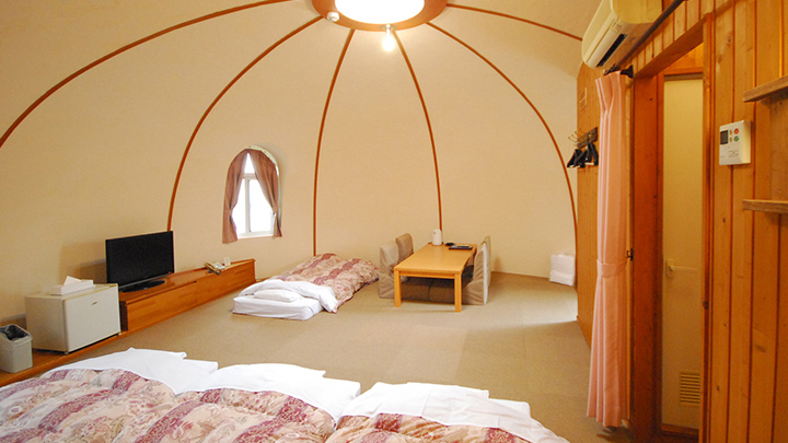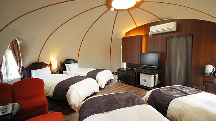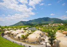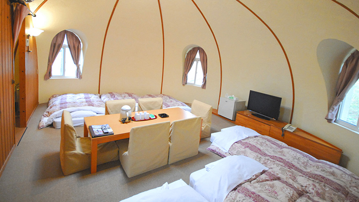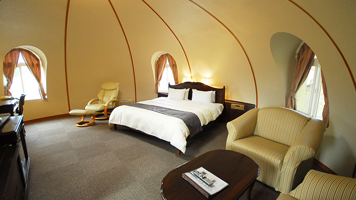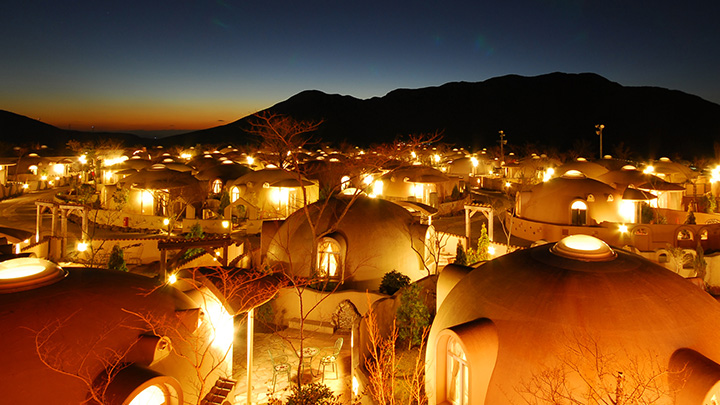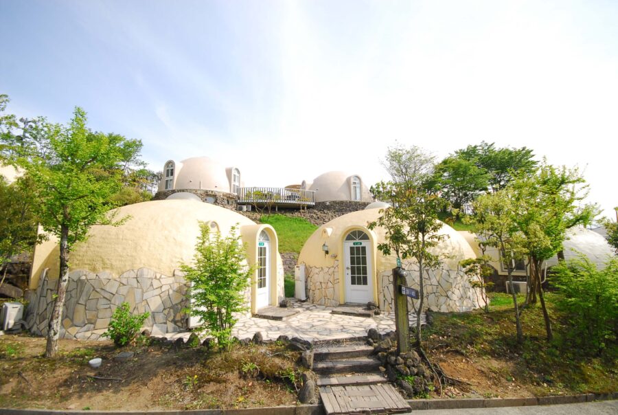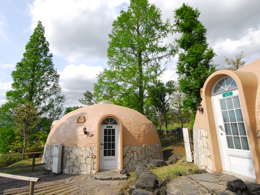 充分利用阿苏雄伟自然地形的森林中的圆顶型酒店。