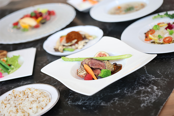 享用采用对身体温和且充满活力的时令食材的菜单。每天从我们自己的邻近阿苏健康农场运送的新鲜蔬菜都是安全种植的,没有农药。请品尝在阿苏凉爽的地下水中种植的蔬菜。